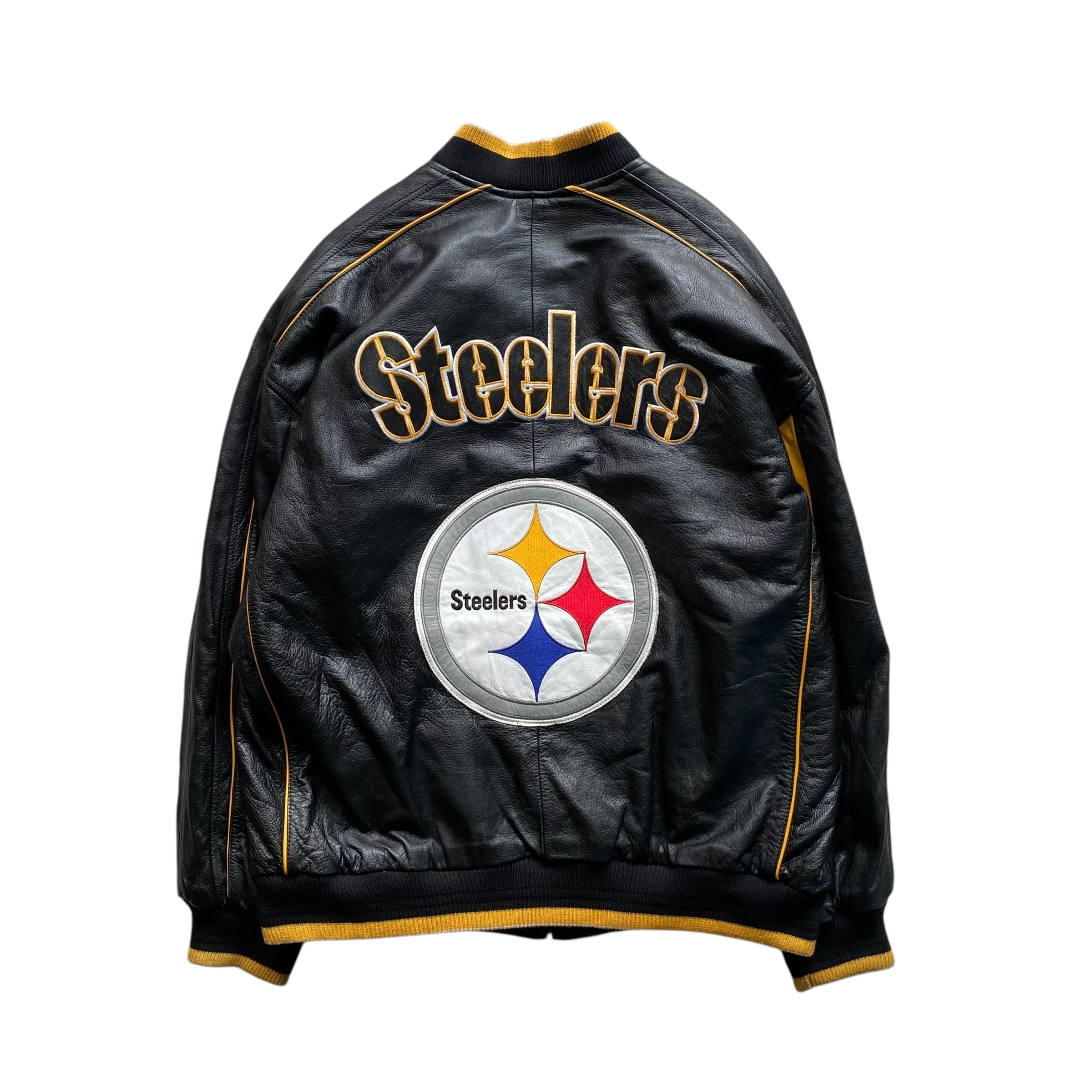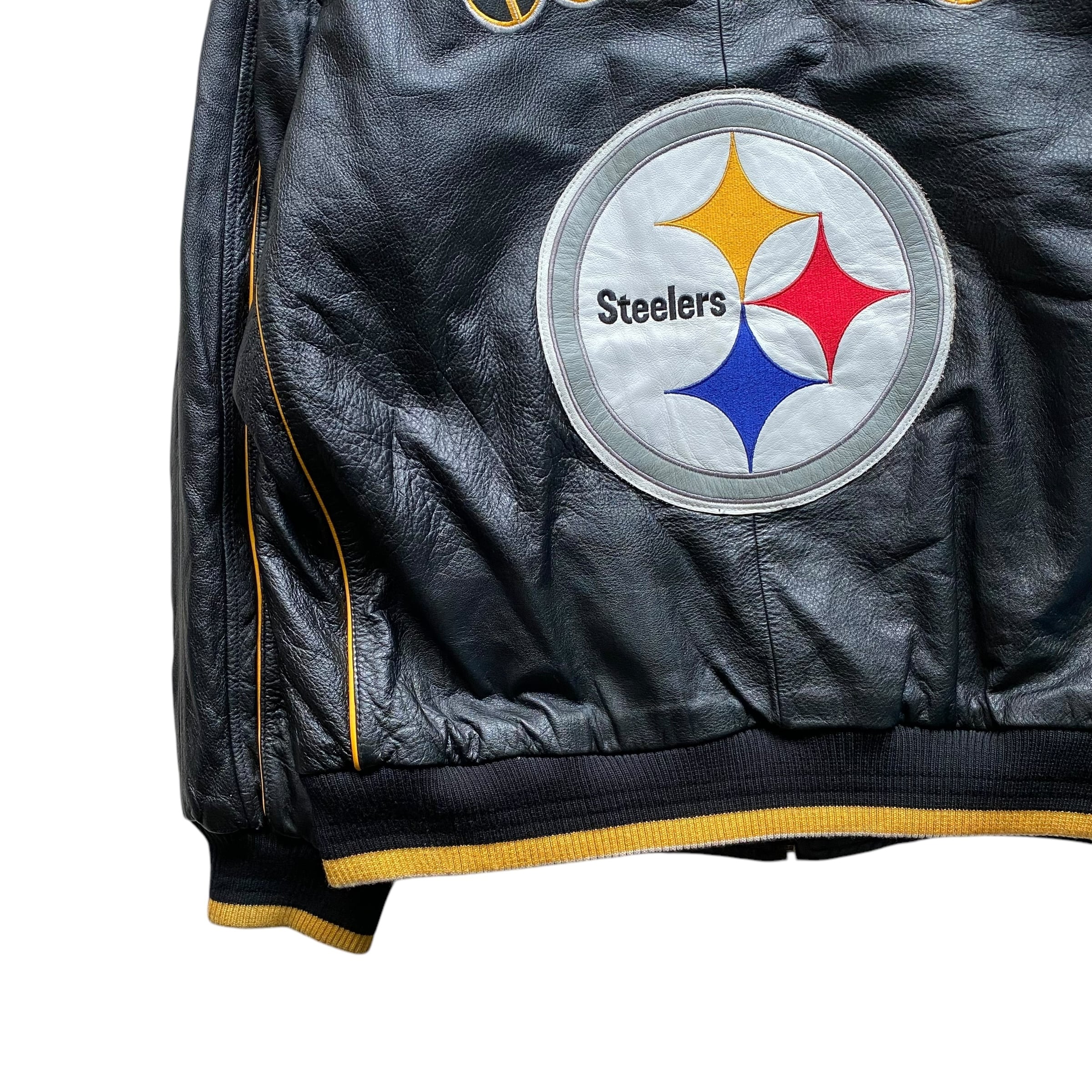 ブラックボディにイエローのパイピングや切り替えが映えるSteelersのレザースタジャン