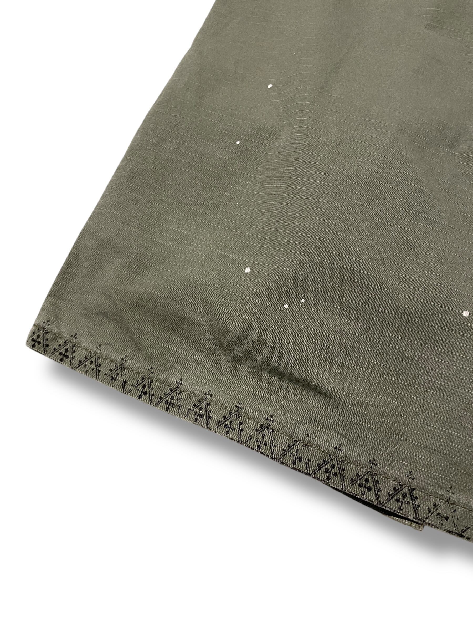 リップストップのミリタリー生地をベースに、ペイズリーや幾何学模様のプリント&刺繍を全面に施した一着。ホワイトペイントのスプラッター加工も加えられ、ヴィンテージとカスタムの空気感を融合させた仕上がりです。