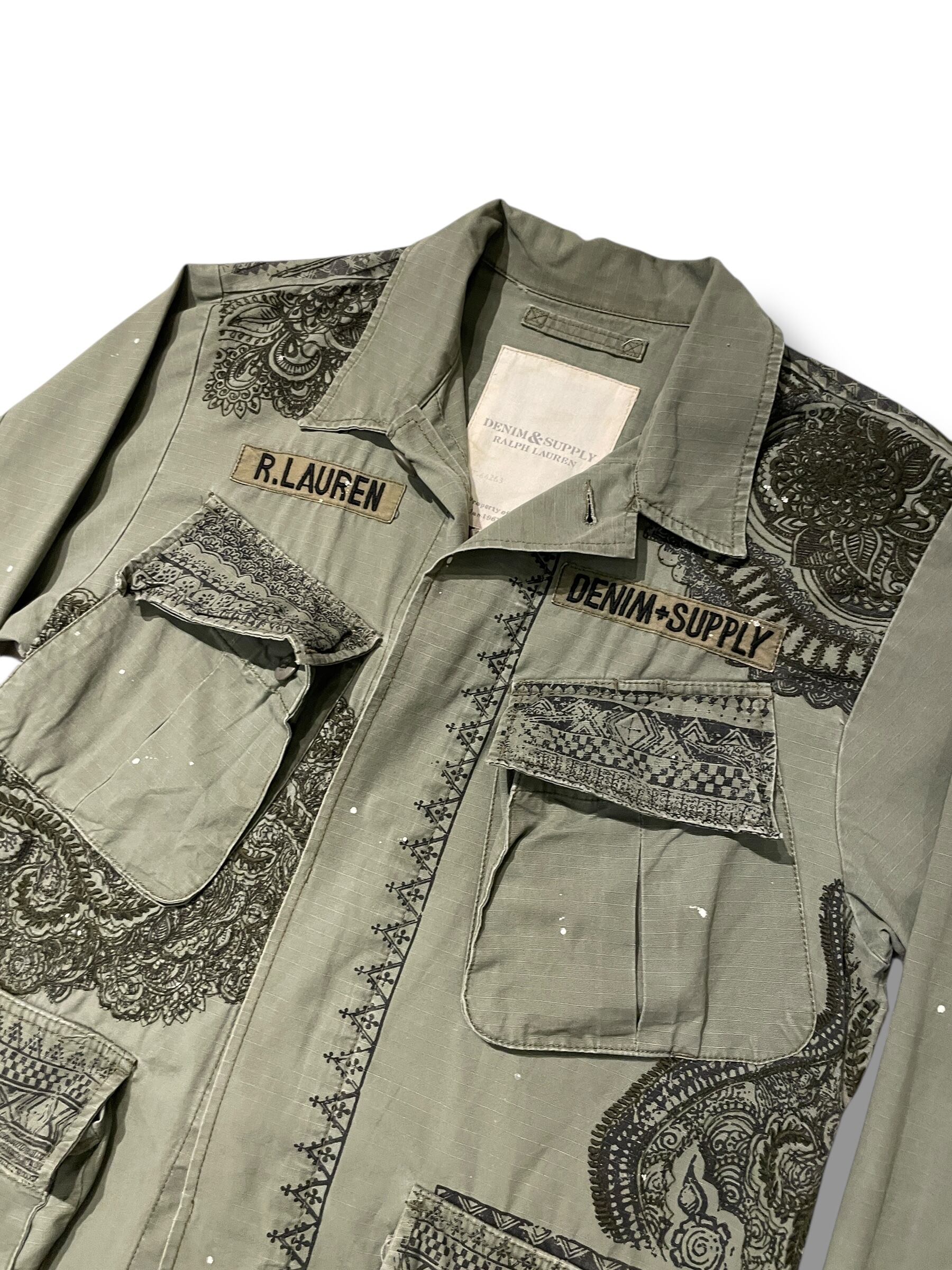 胸元には「R.LAUREN」「DENIM+SUPPLY」のミリタリーパッチ。オリジナルのUS ARMYファティーグを彷彿とさせながらも、サブカルチャーやアートの匂いをまとったDENIM & SUPPLYらしいデザイン。