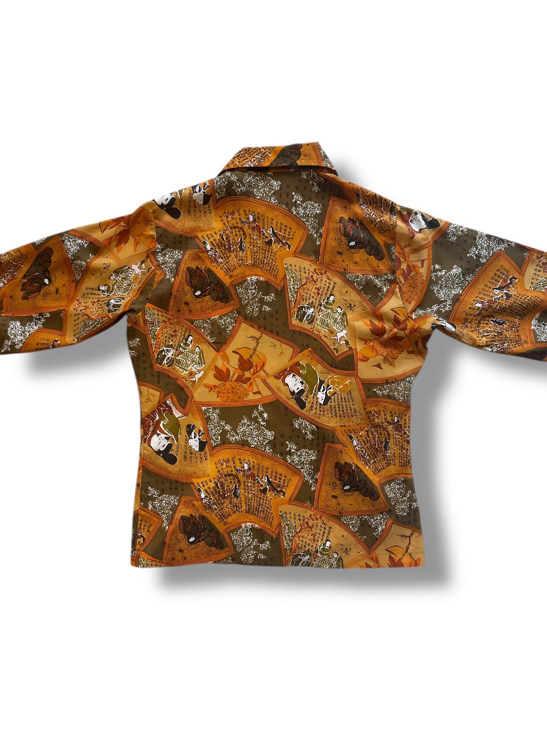 フロントからバックにかけて全面に広がるのは、扇子や古典人物画、草花モチーフを散りばめた和柄プリント。アメリカブランドならではの解釈で再構築されたデザインは、オリエンタルなムードと70’sレトロ感がミックスされた独特の存在感を放ちます。