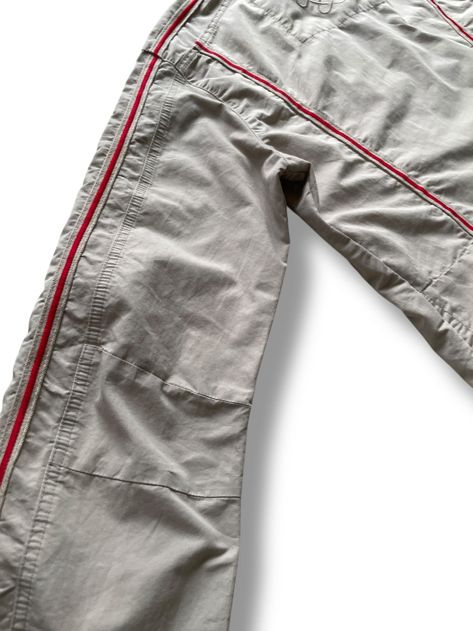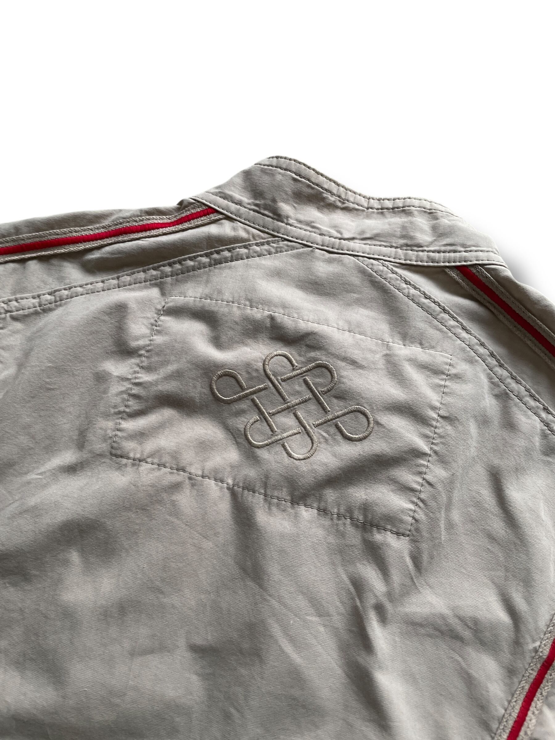 ベージュベースに映えるレッドのパイピングラインがアクセントとなり、スポーティかつ都会的な雰囲気を演出。スタンドカラー+フロントジップ仕様で、ミニマルながらディテールにこだわった一着です。