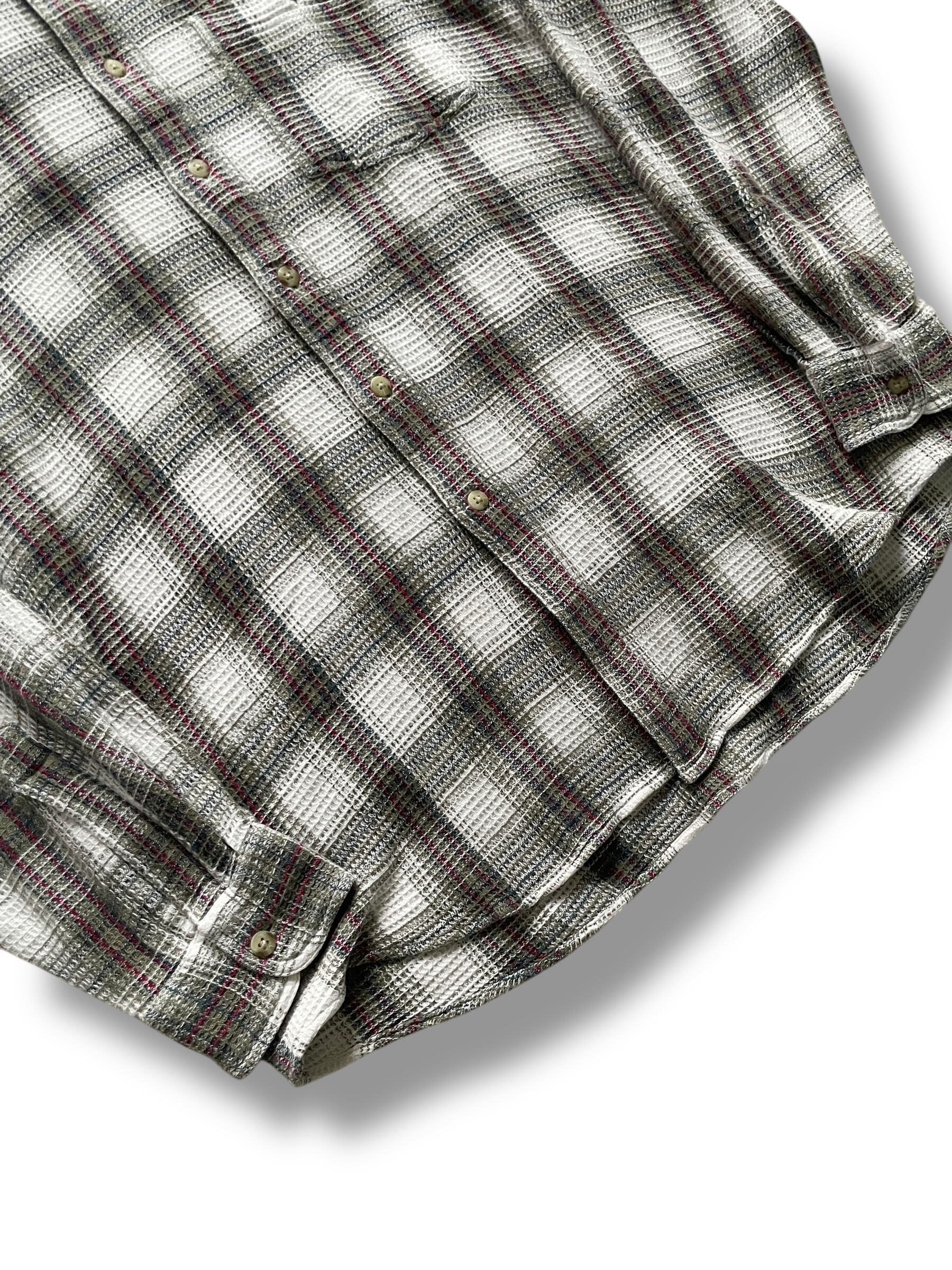 グレー × ホワイトにレッドラインが効いたクラシックなチェック柄に、珍しいワッフル織り生地を採用。凹凸のある立体的な質感が、ネルシャツやツイルシャツにはない独特の表情を見せてくれます。