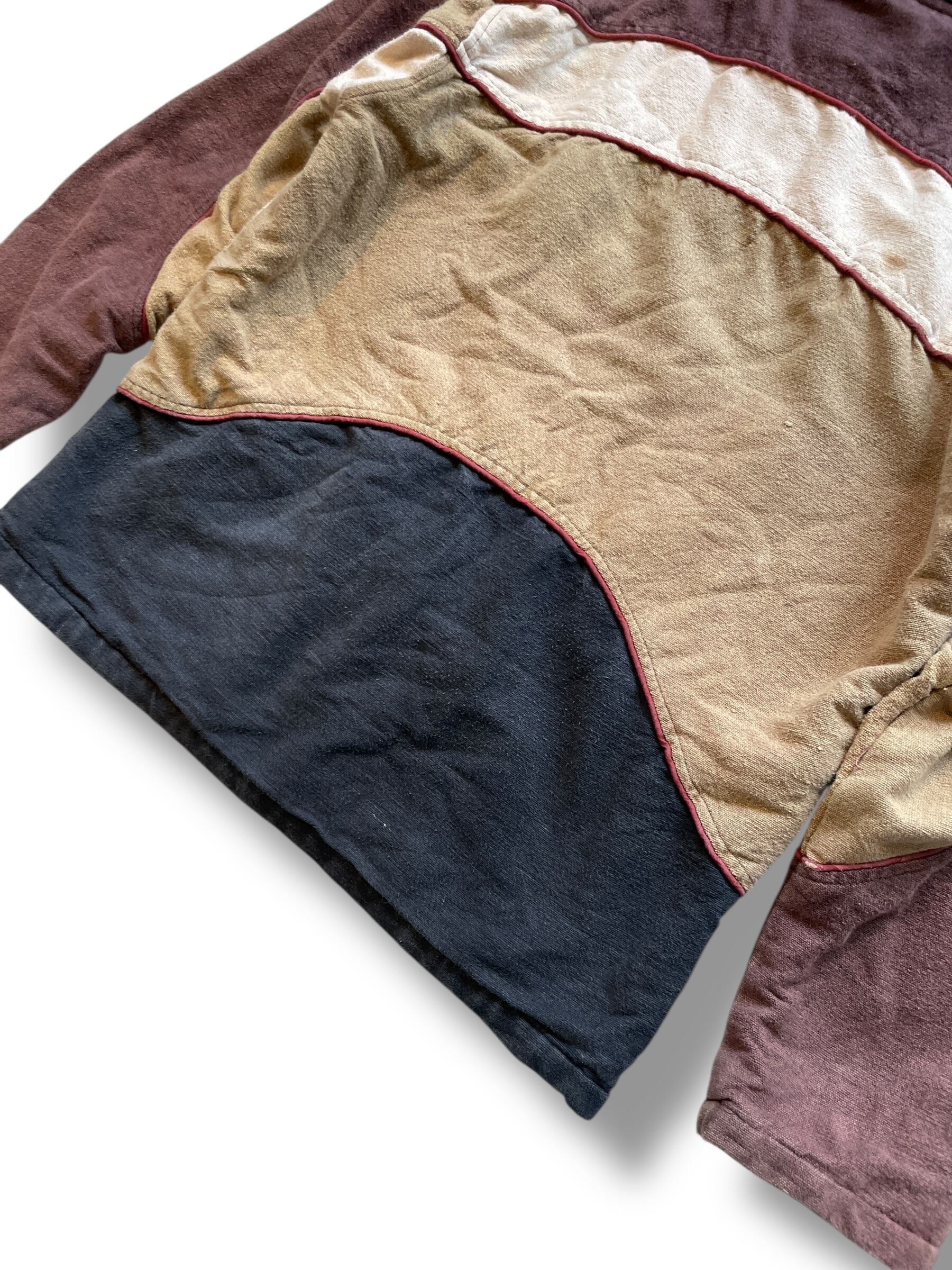 ブラウン〜ベージュ〜ブラックの3トーンを切り替えたパッチワークデザインで、素朴さと力強さを感じさせる民族調の雰囲気。