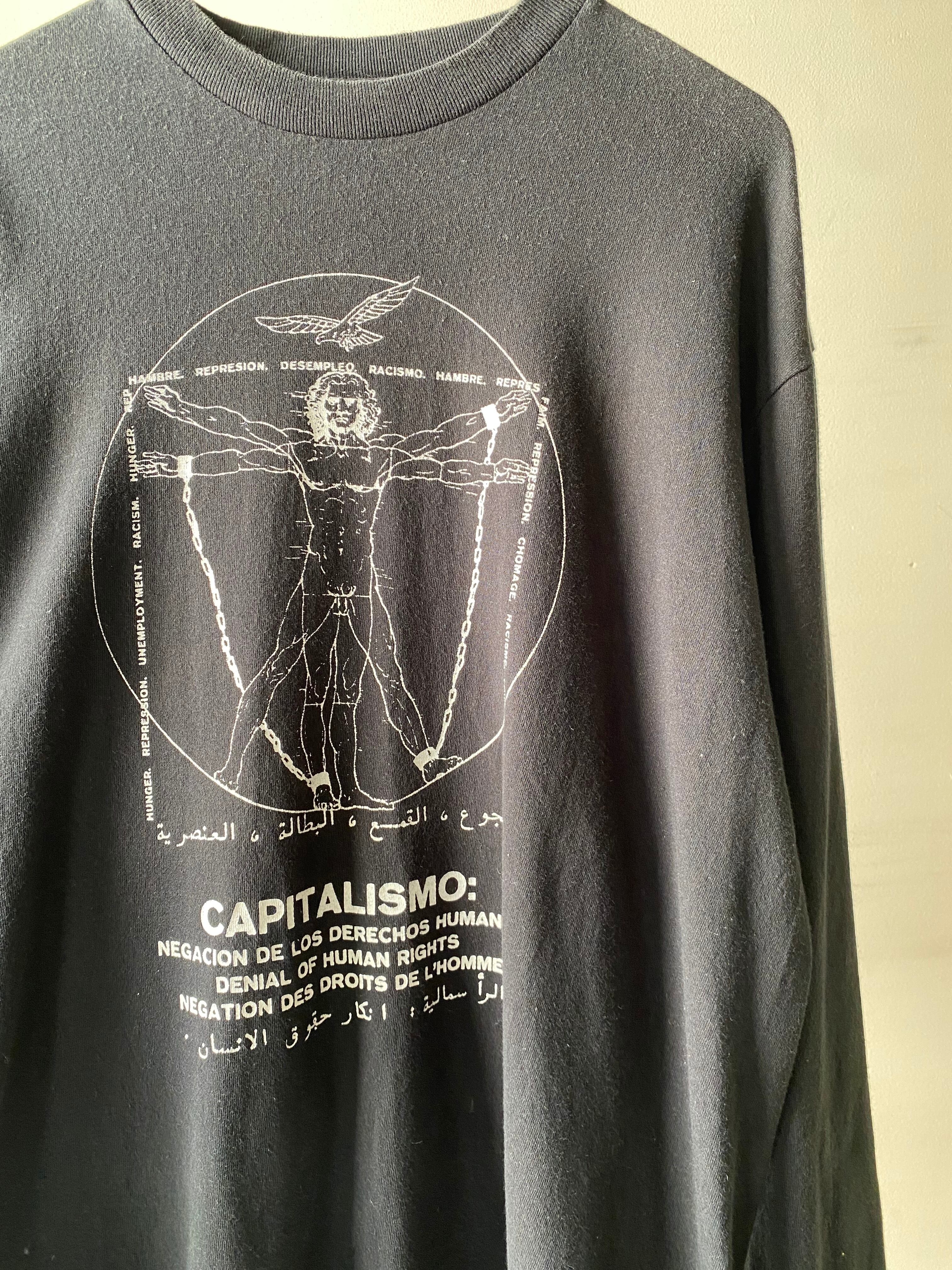 資本主義を意味するCAPITALISMOとそれを否定するメッセージが込められたsupremeのロンT