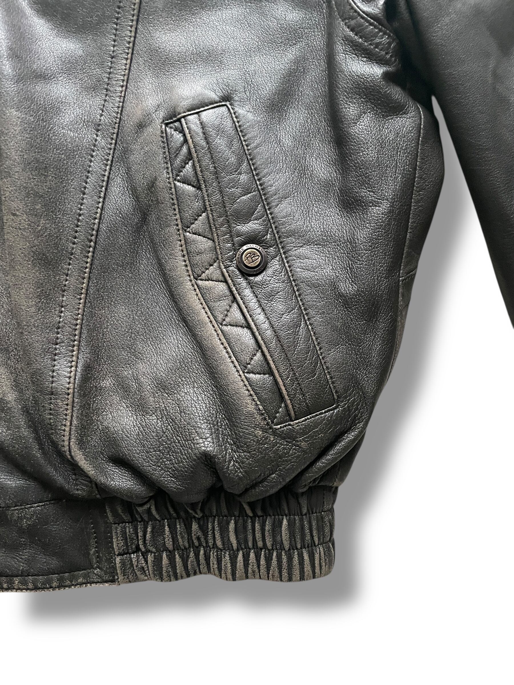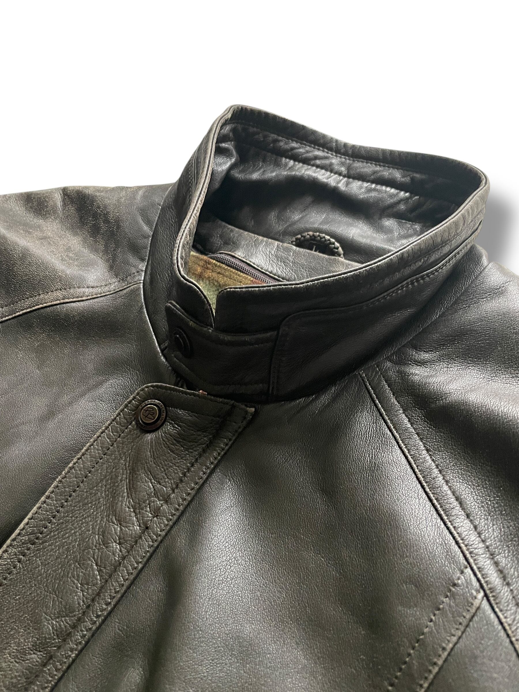 Pierre Balmain(ピエール・バルマン)のレザージャケット。柔らかく滑らかな羊革(ラムレザー)を使用し、上質な質感と軽やかな着心地が魅力です。フロントはジップ&ボタン仕様、襟はスタンドカラーでも着用可能。フラップポケットのステッチワークがアクセントになっています。さらに、取り外し可能なライナーが付属しており、シーズンを跨いで活躍する実用性も備えた一着。ラグジュアリーな質感とヴィンテージらしい風合いを兼ね備えたジャケットです。