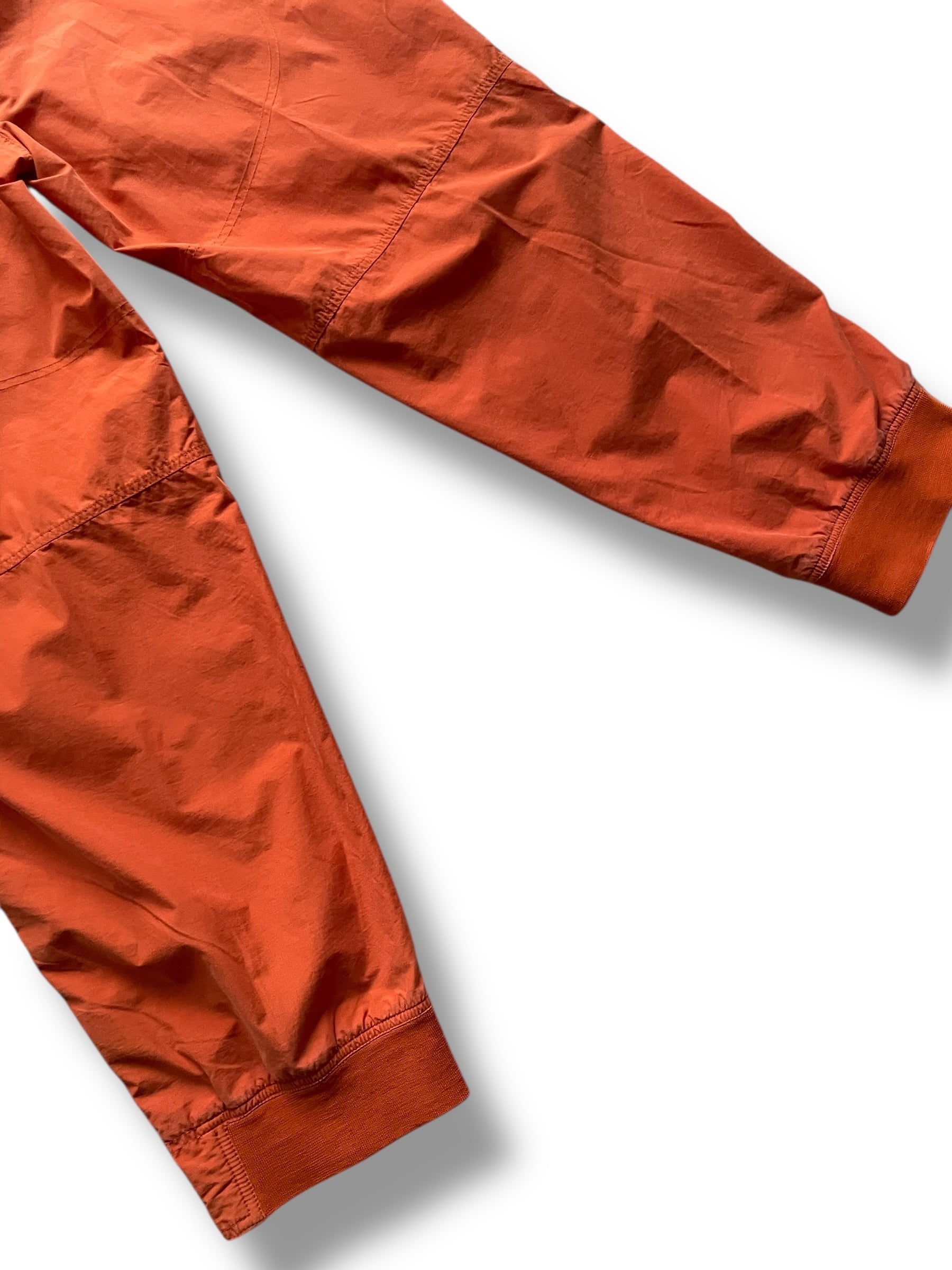 鮮やかなオレンジカラーが映える一本で、膝部分のパッチデザインや裾まで走るサイドジップが特徴的。アウトドアやスポーツの要素をミリタリーに落とし込んだ独特な雰囲気を持ち、シンプルなトップスと合わせるだけで存在感のあるコーディネートに仕上がります。