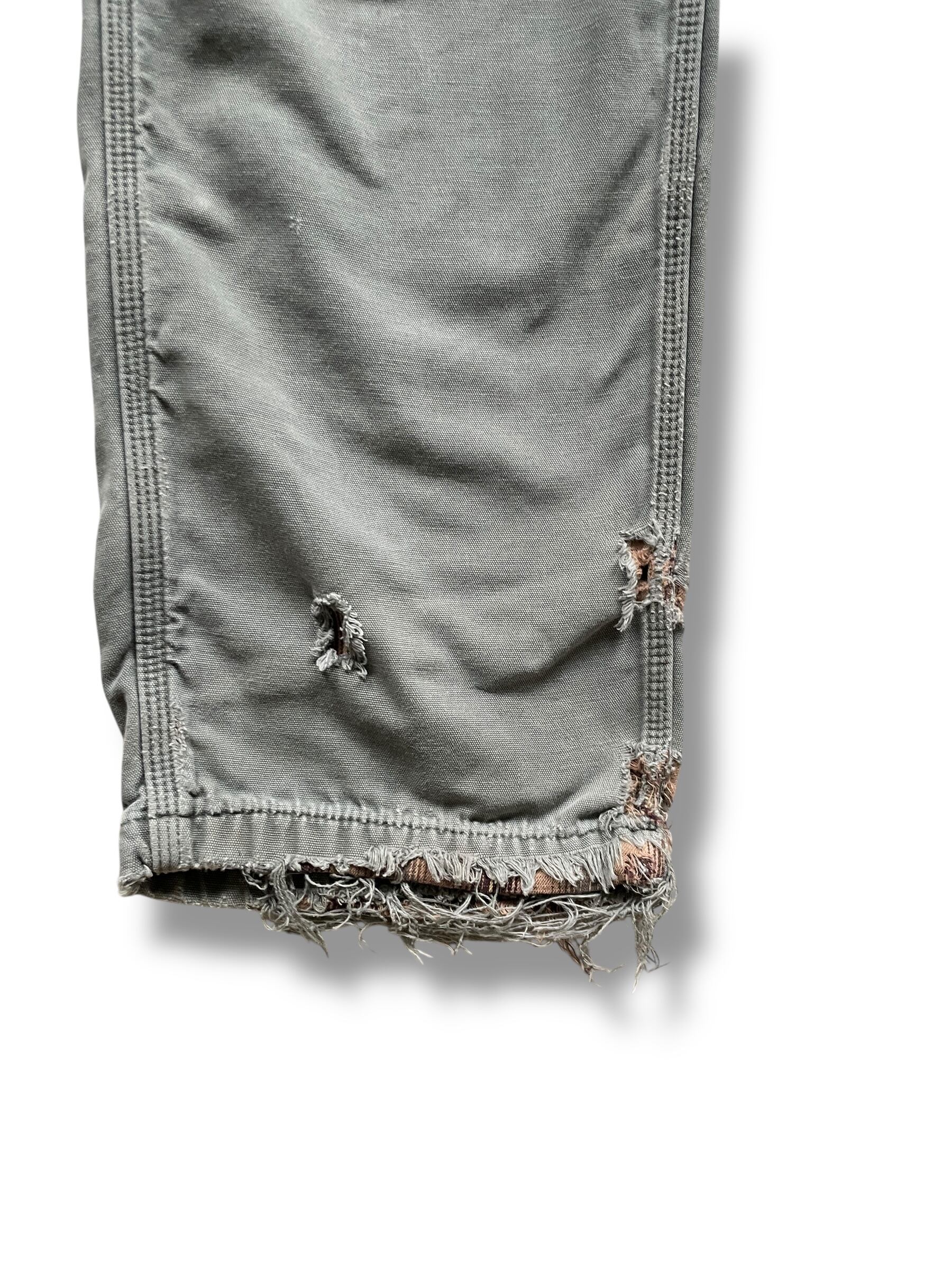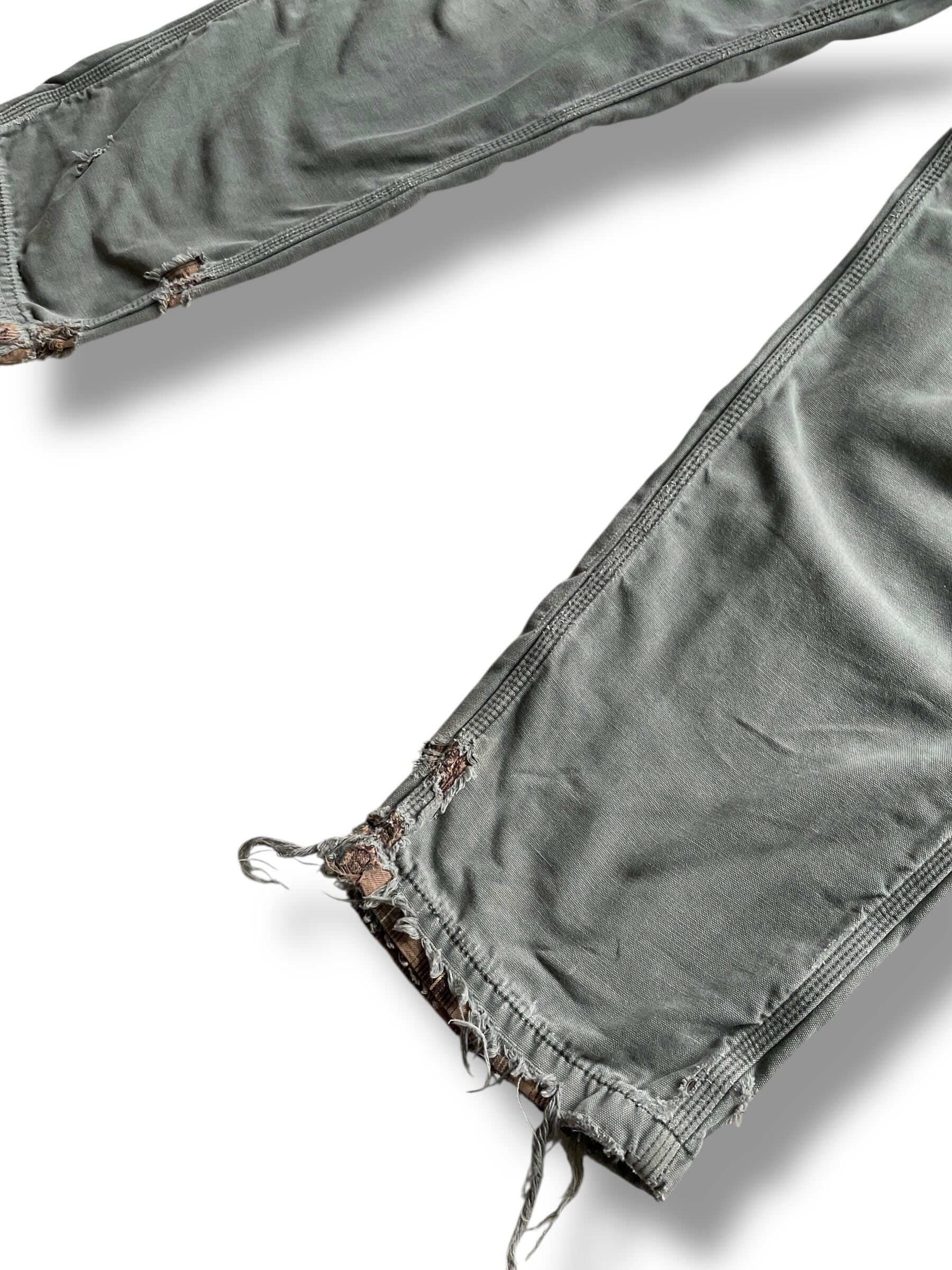 ボロさで裏地のチェックが見え隠れしている雰囲気良いカーハートのワークパンツ