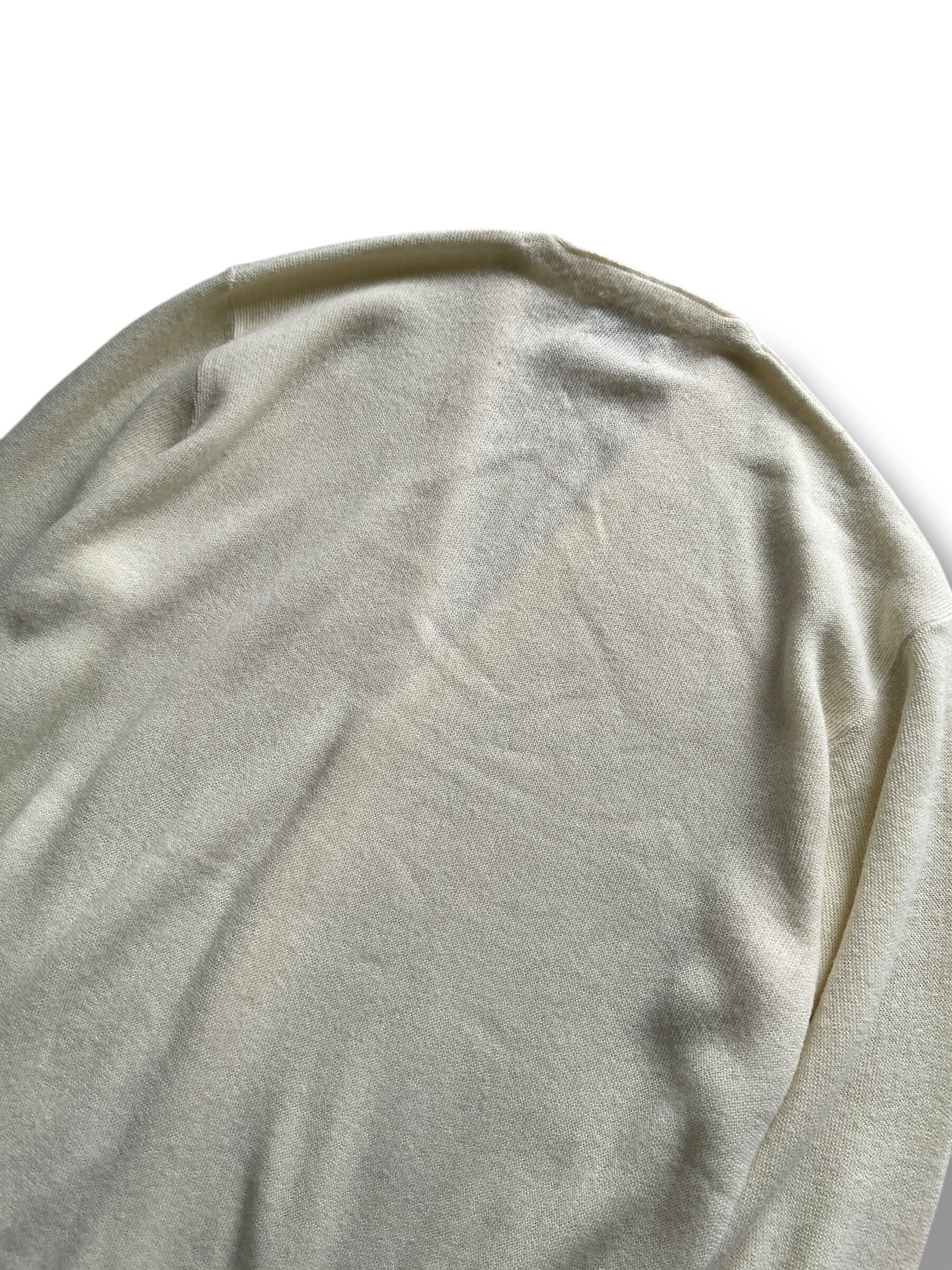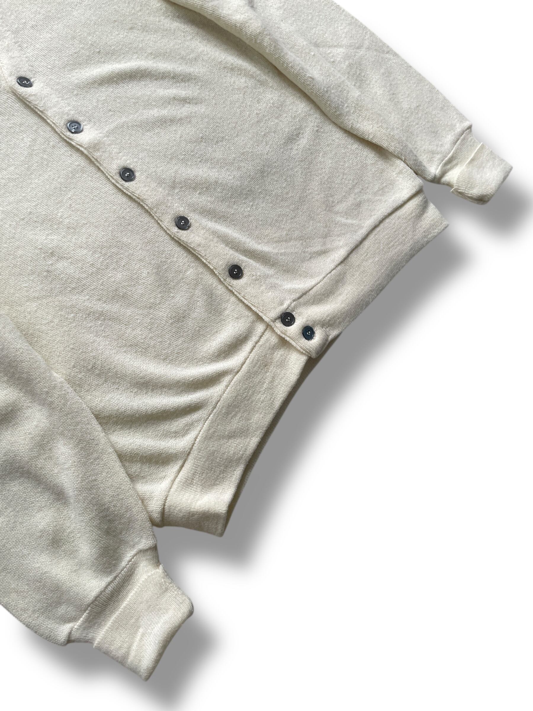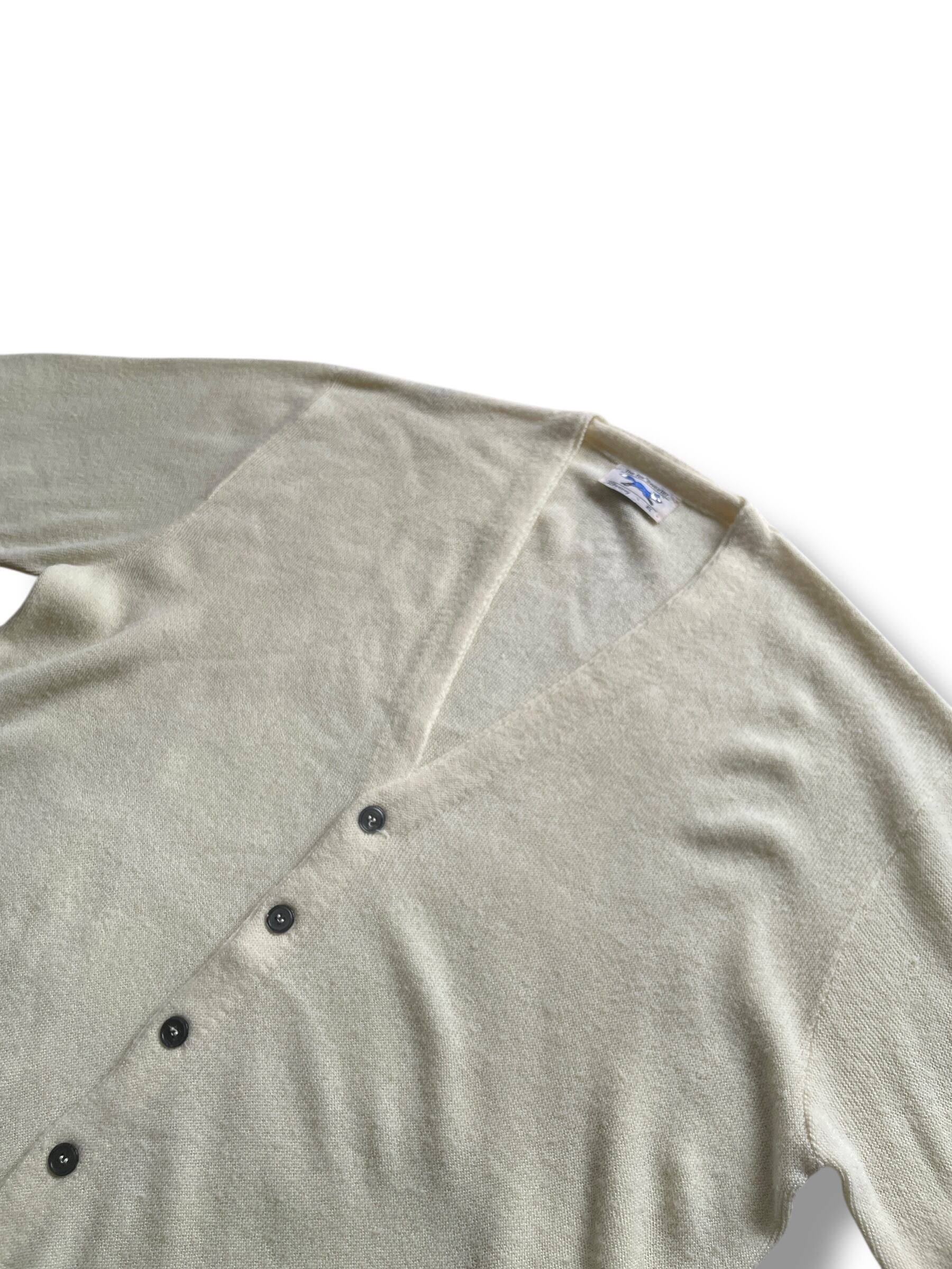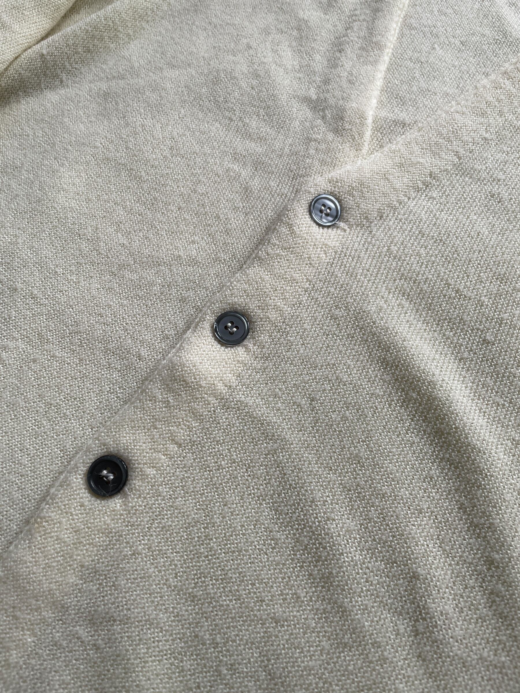 柔らかい生成りホワイトのボディに、深いVネックと7つボタンのクラシックなディテールが際立つ一枚です。