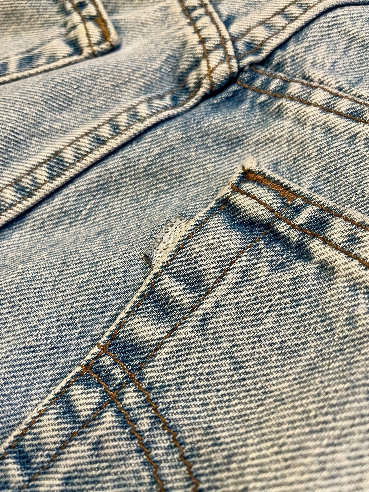 全体的にフェード感あり。バックポケットにリペア跡あり。着用には問題ありません。