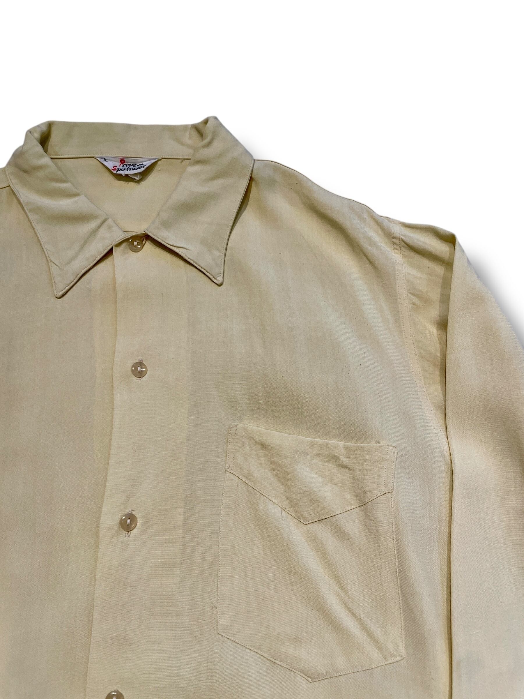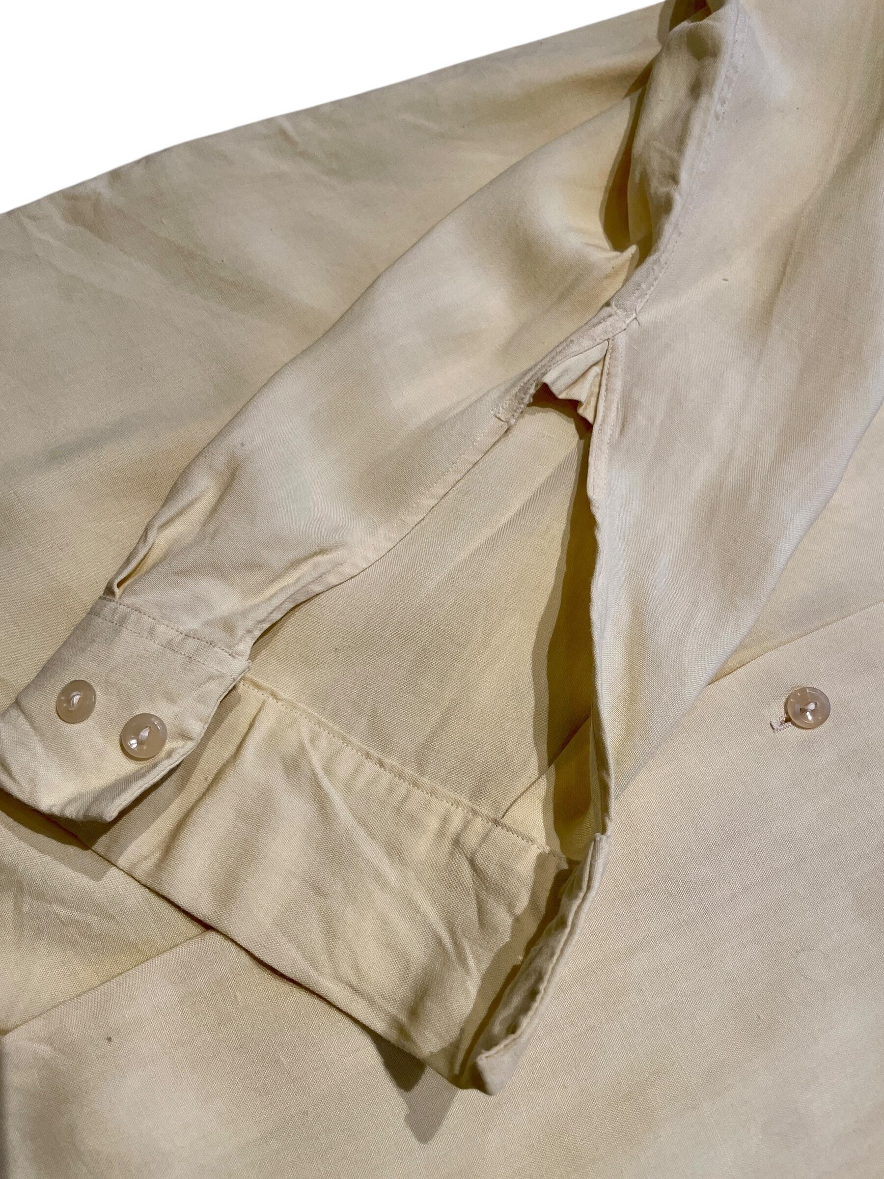 上品なクリームカラーに、ロングポイントの襟やフラップ付き胸ポケットといった当時らしいディテールを備えています。