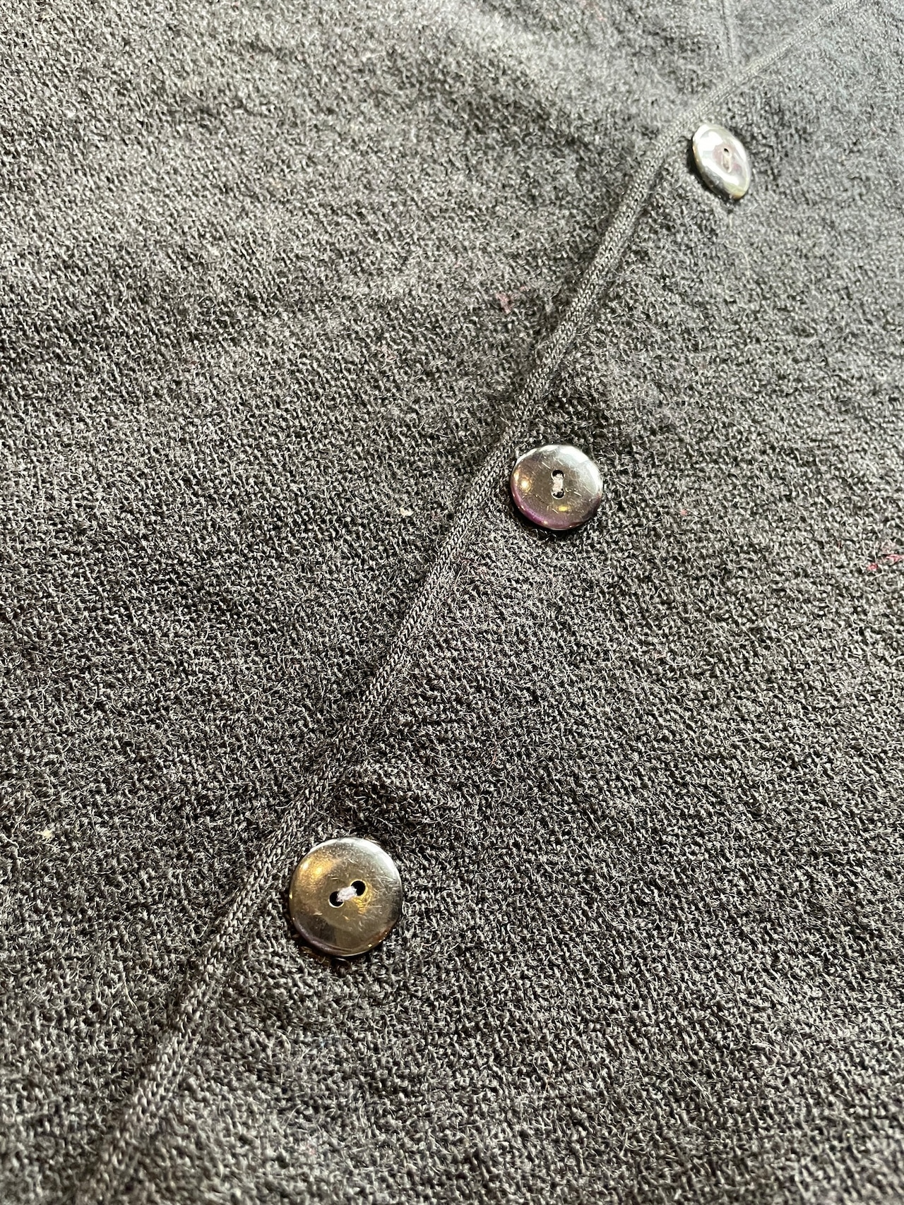 ふんわりとした柔らかいタッチのニット地で仕立てられ、シンプルなブラックに艶のあるボタンが上品なアクセント。