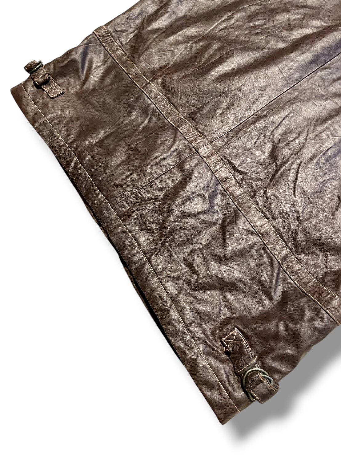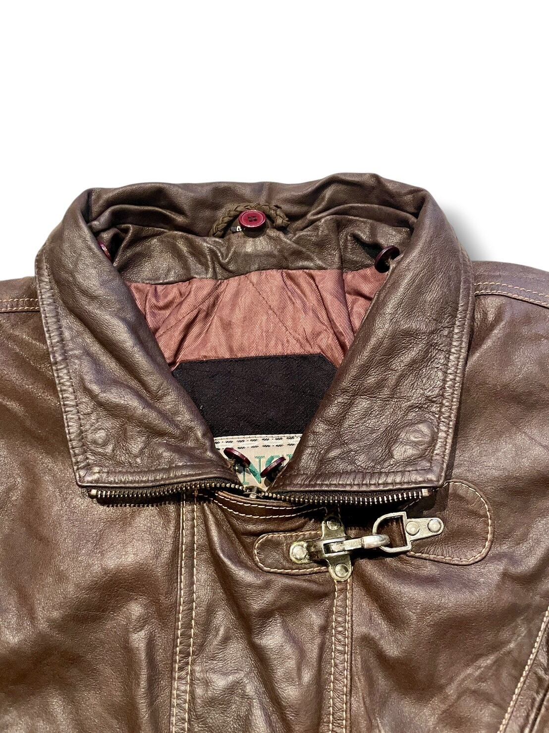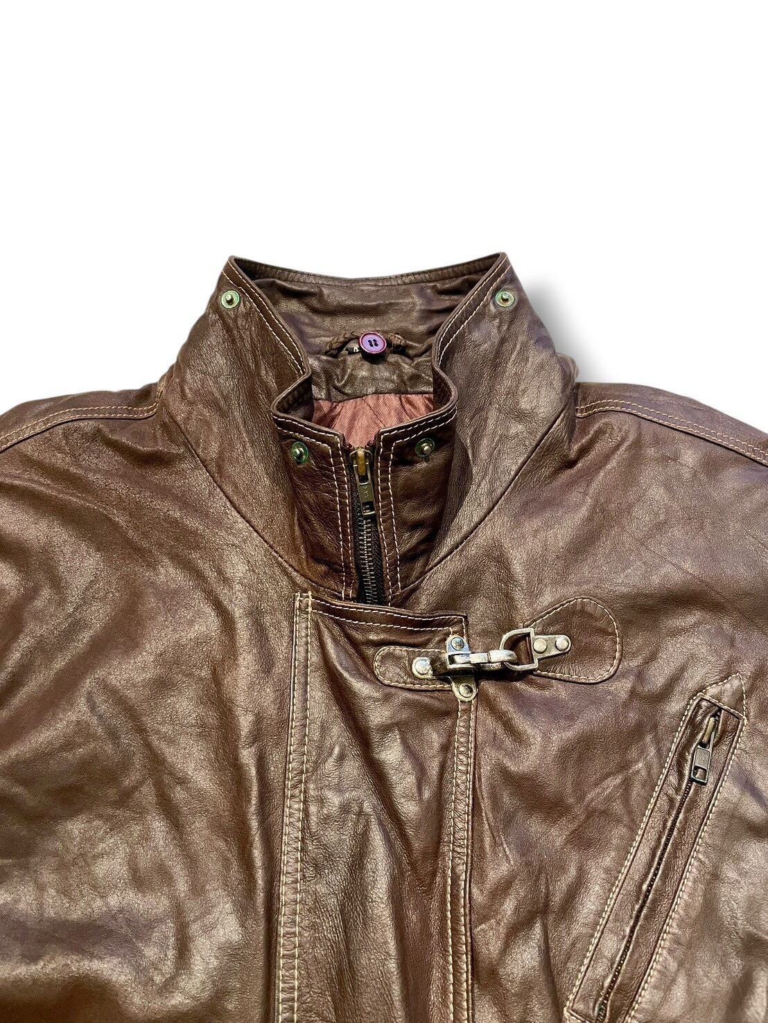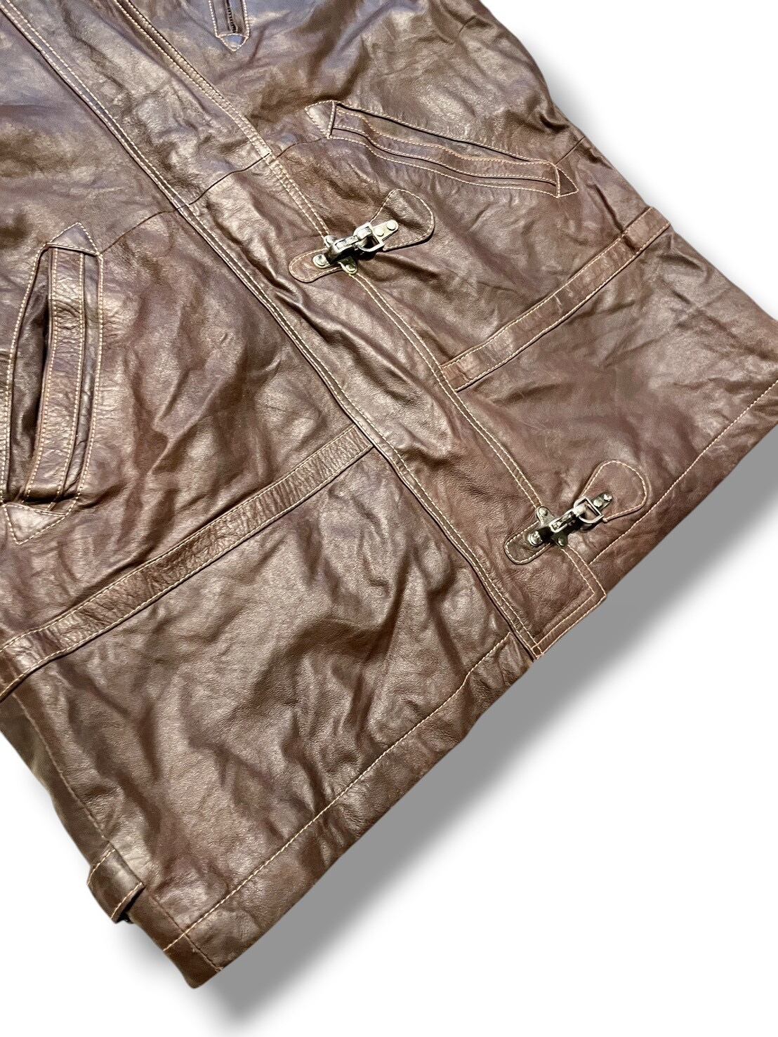 落ち着きのあるブラウンカラーのレザーに襟袖のボア切り替えで古着らしいハイセンスな作り