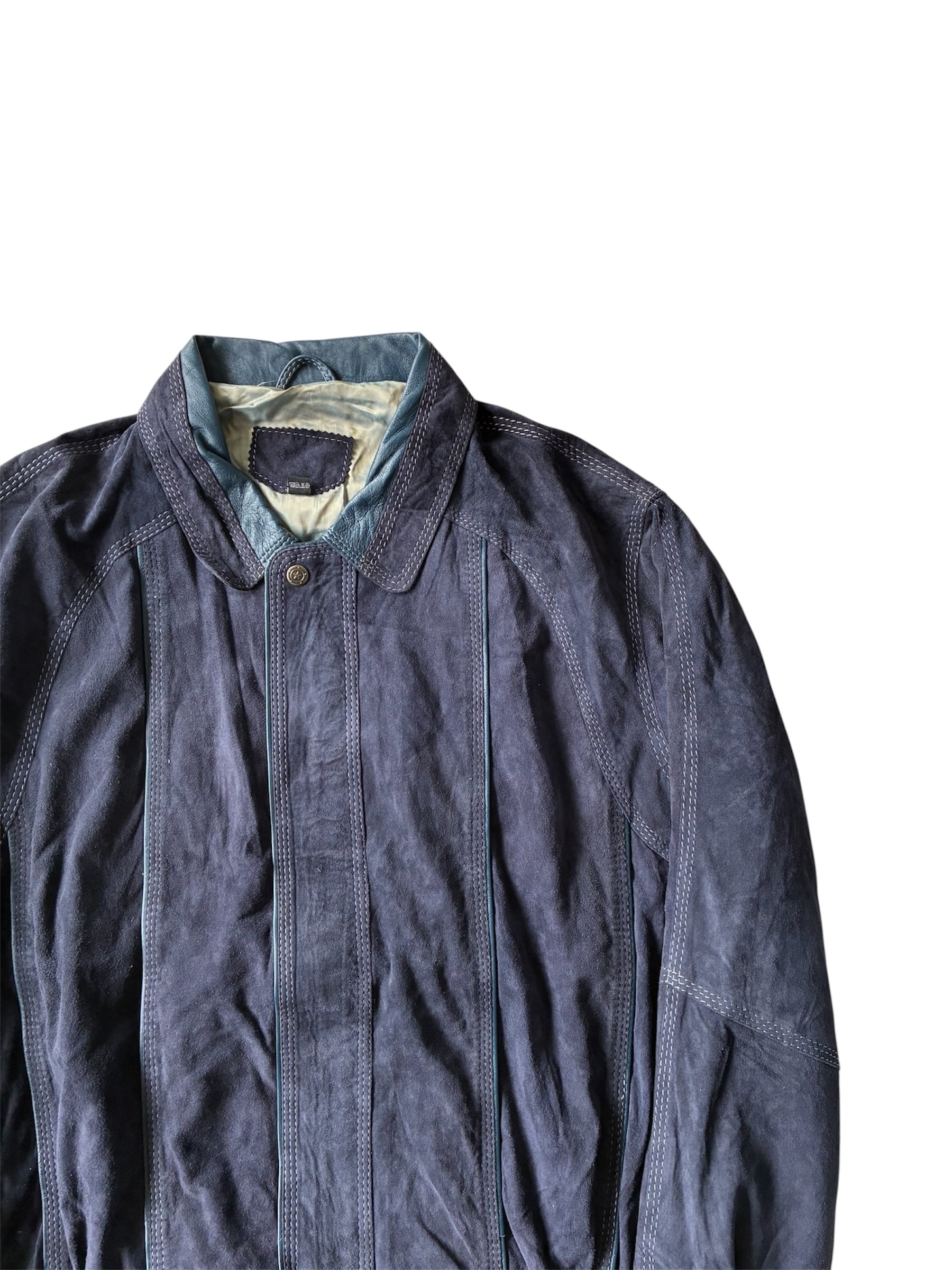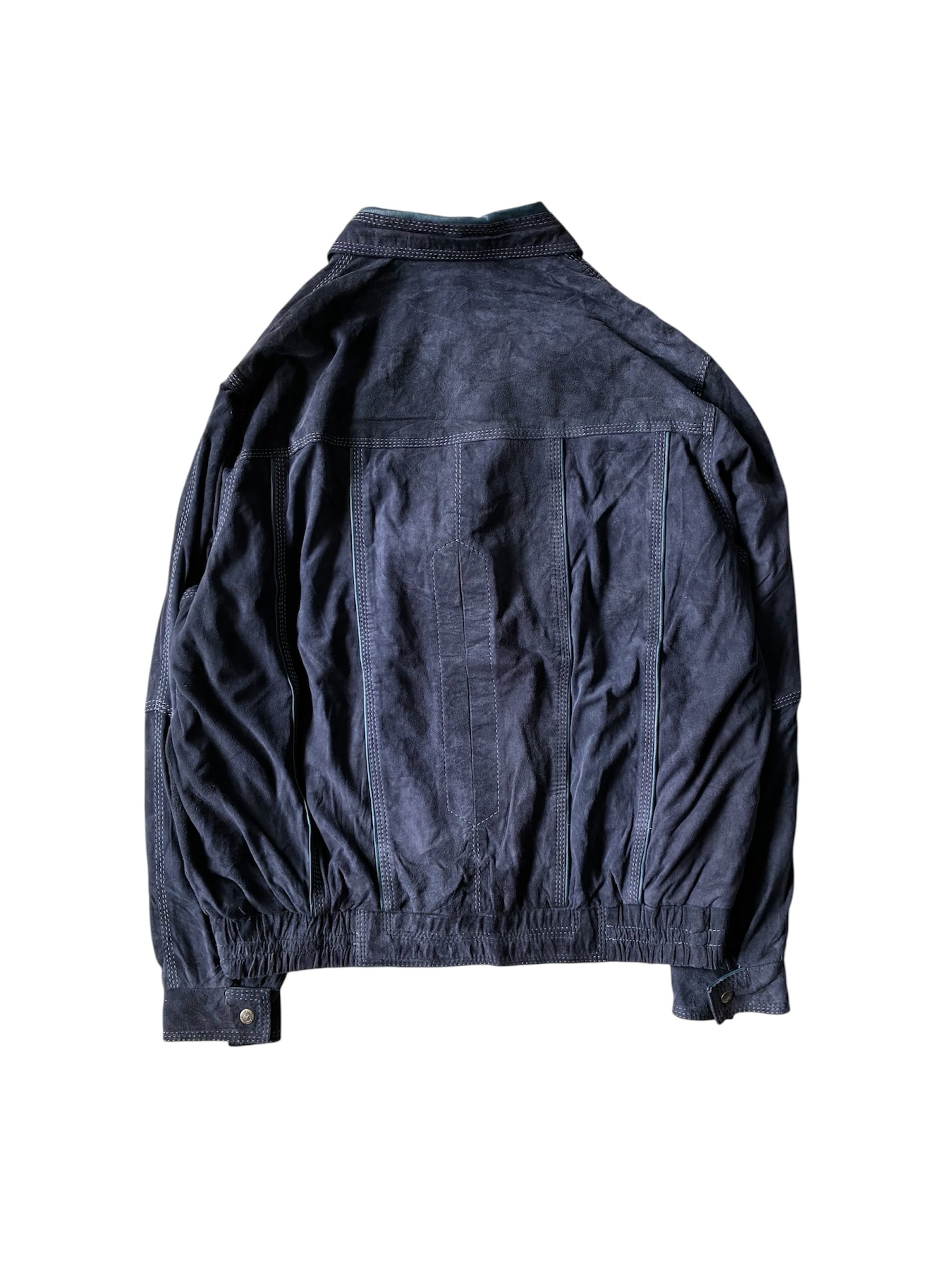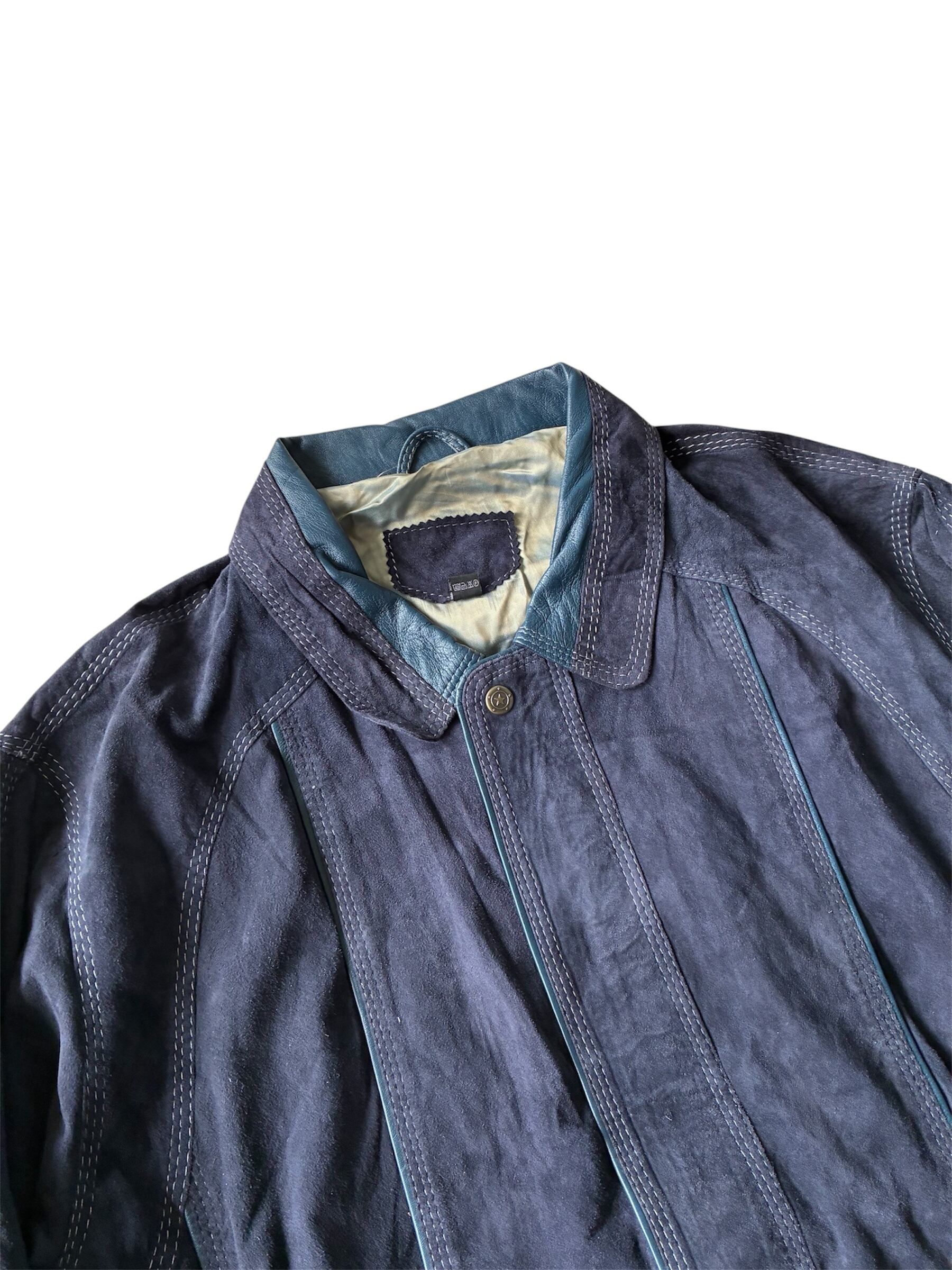 深いネイビーカラーのボディに襟やパイピングでのレザーの切り替えデザイン