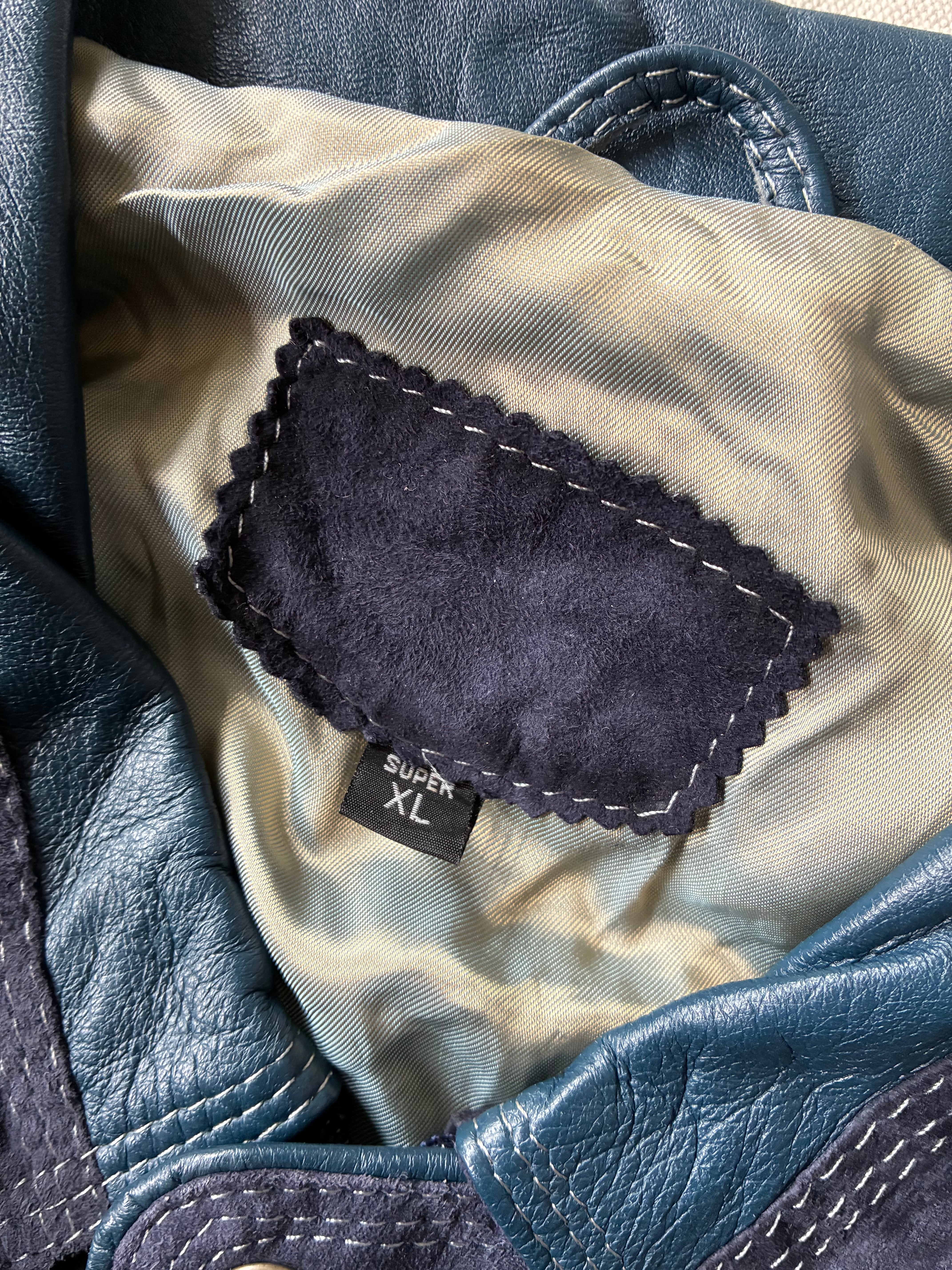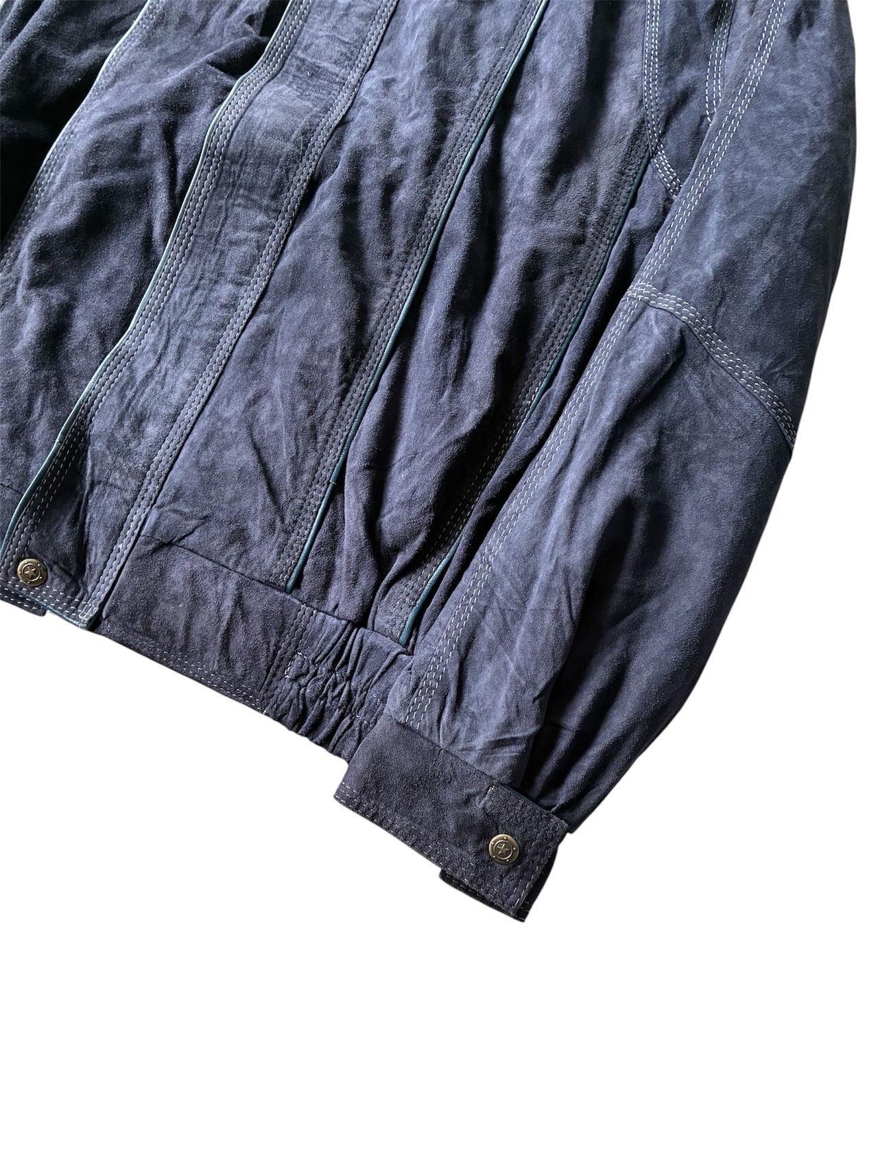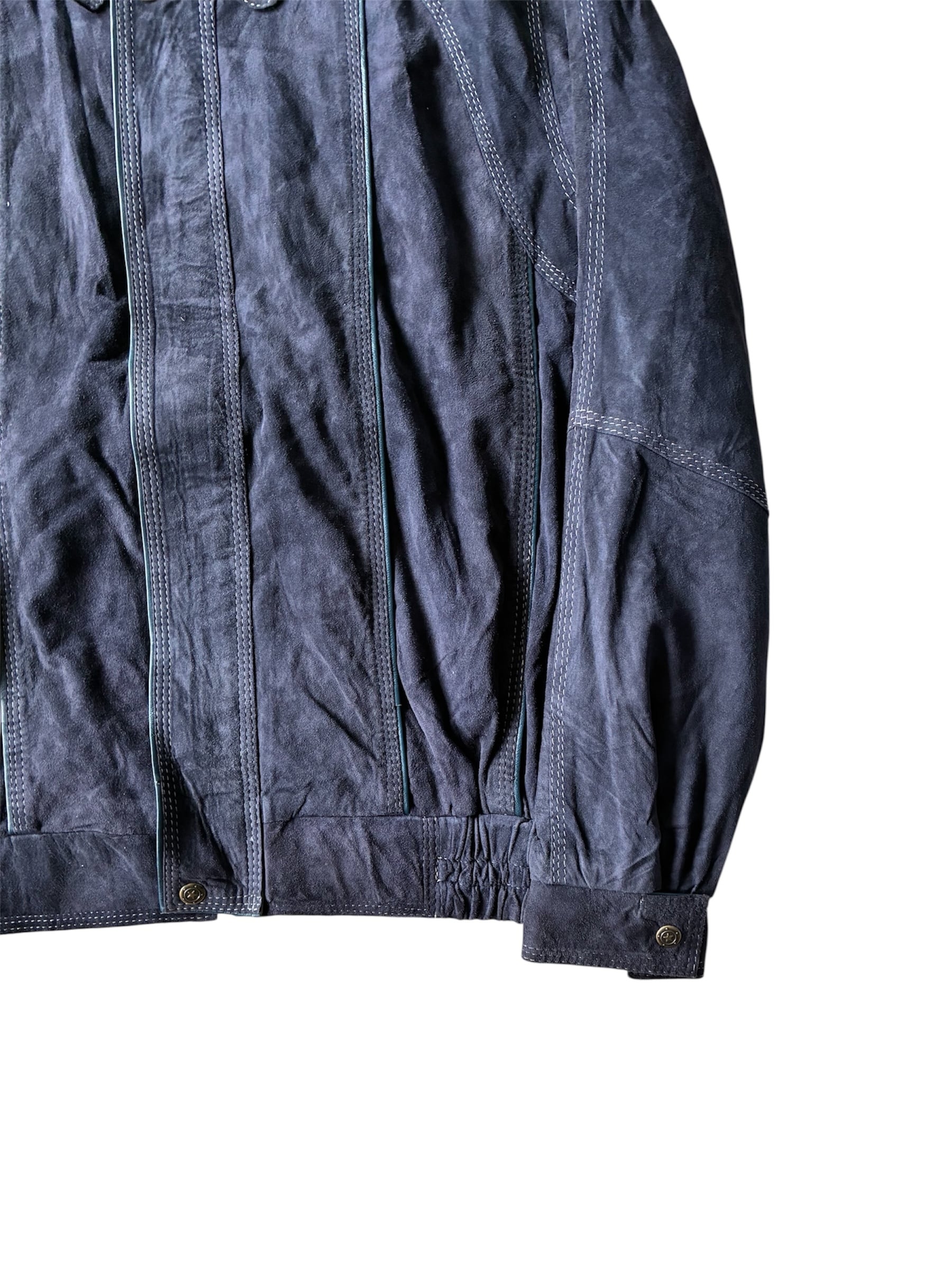 深いネイビーカラーのボディに襟やパイピングでのレザーの切り替えデザイン