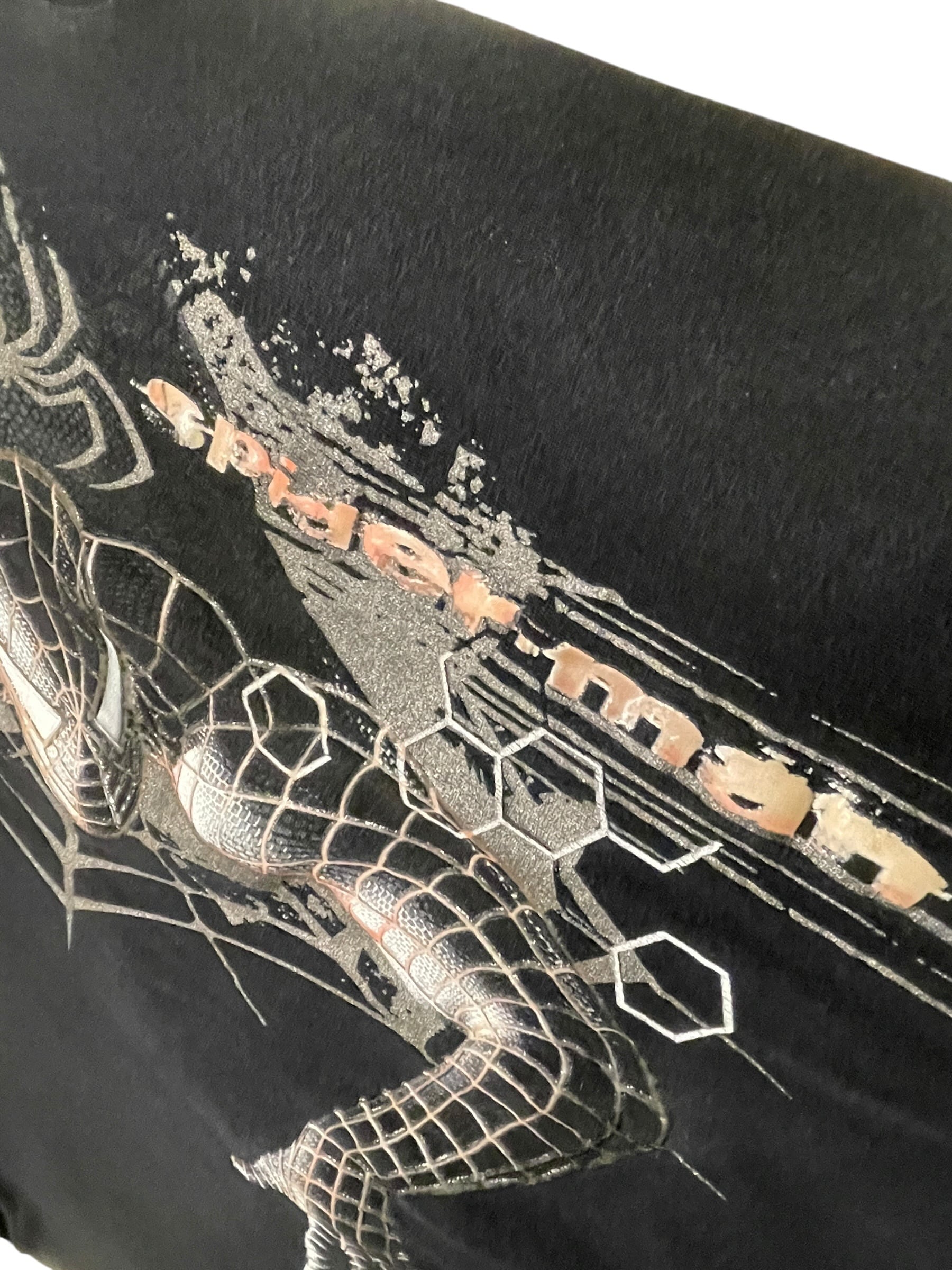 ブラックスーツのスパイダーマンを大胆に配置したデザインで、クモの巣や幾何学モチーフを組み合わせた立体感のあるプリントが特徴です。