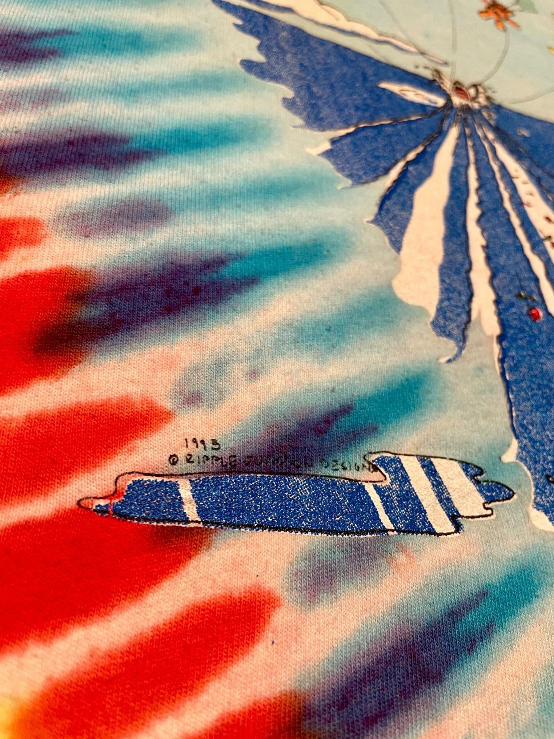 そのカルチャー背景を感じさせる、90年代らしいタイダイとユーモラスなグラフィックが魅力の一枚。